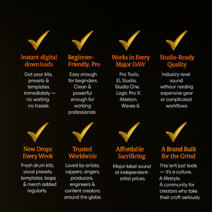 Unlock industry-quality drum kits, vocal presets, mix templates & music lifestyle gear — all designed to help you create faster, sound cleaner, and level up your grind.